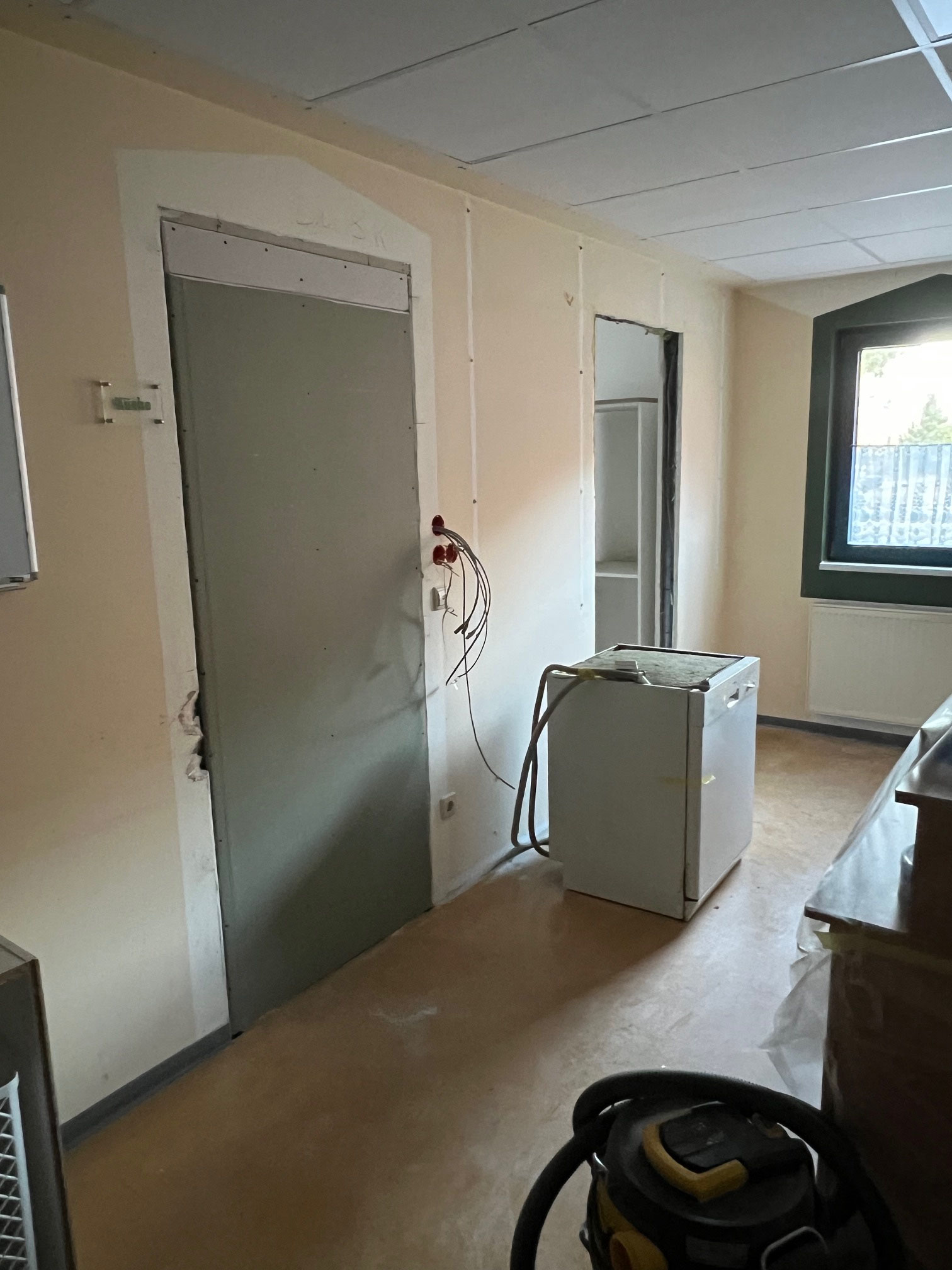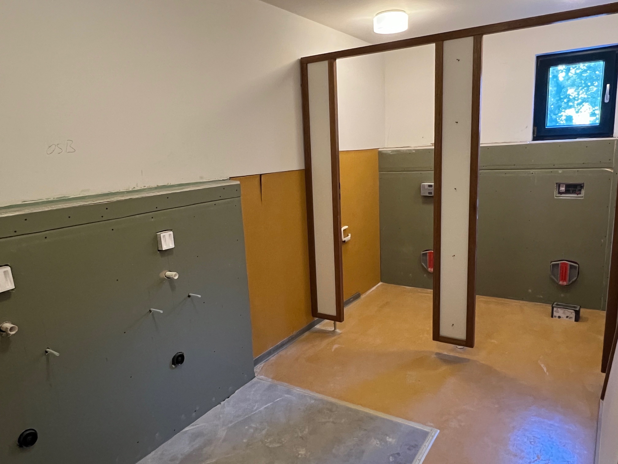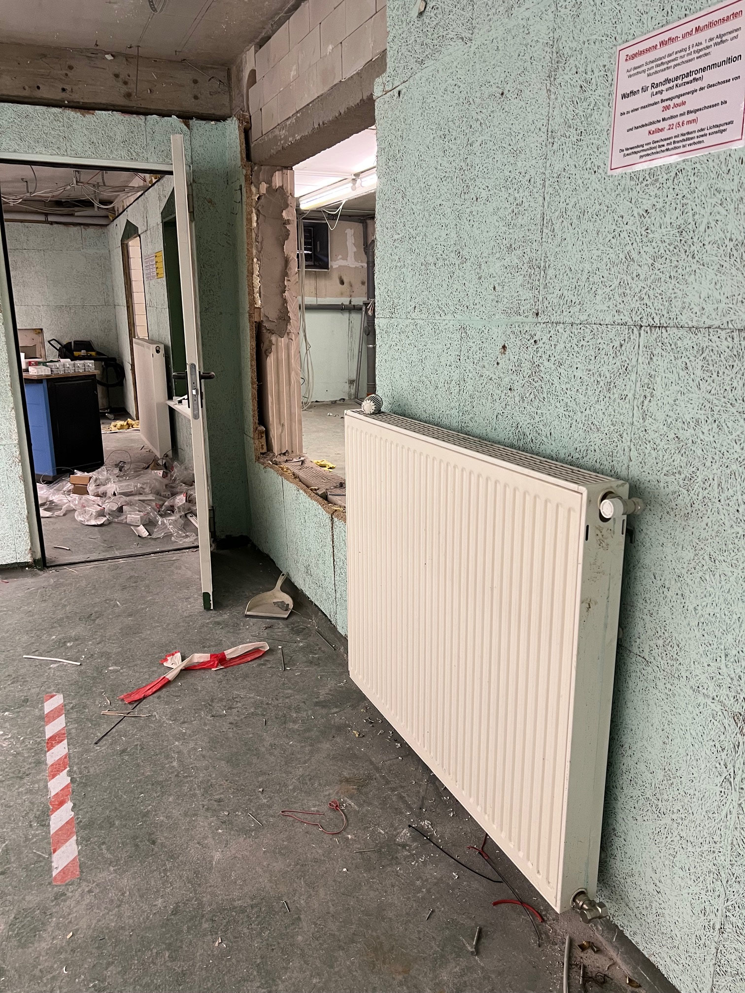 Mittlerweile kann man schon sehen, dass sich einiges verändert, auch an den Räumlichkeiten, z.B. der neue, separate Zugang zum GK-Stand oder das neue Fenster im Vorraum des KK/GK-Standes. Zukünftig können alle Stände vom Steuerungs-PC aus eingesehen werden. Oder auch im bisherigen Auswerteraum, der zum Teil als Behinderten-WC und Getränkeraum umgebaut wird, sind die Türausschnitte bereits freigelegt. Für die Auswertung bleibt aber noch genügend Platz. Auch wurden die alten Versorgungsleitungen freigelegt, damit dort die neuen Versorgungsleitungen für die Lüftungsanlage ebenfalls untergebracht werden können.