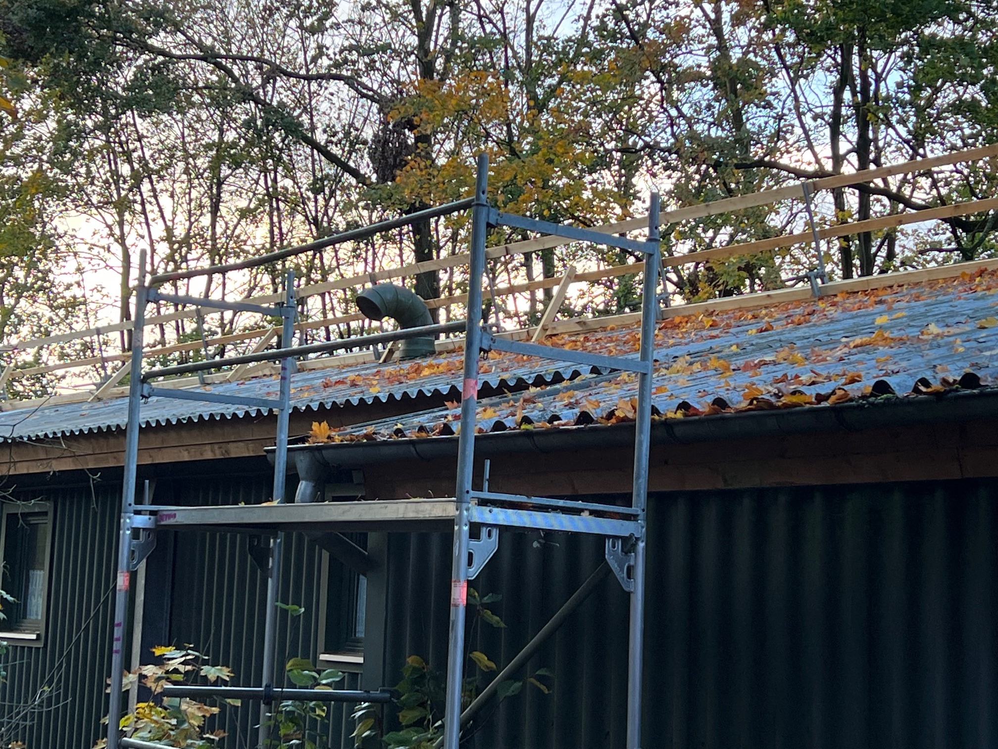 Auch auf dem Dach tut sich einiges: Der Dachdecker ersetzt beschädigte Platten, erneuert den gesamten First und führt zusätzliche statische Optimierungen durch, um die Gebäudesubstanz weiter zu stärken.