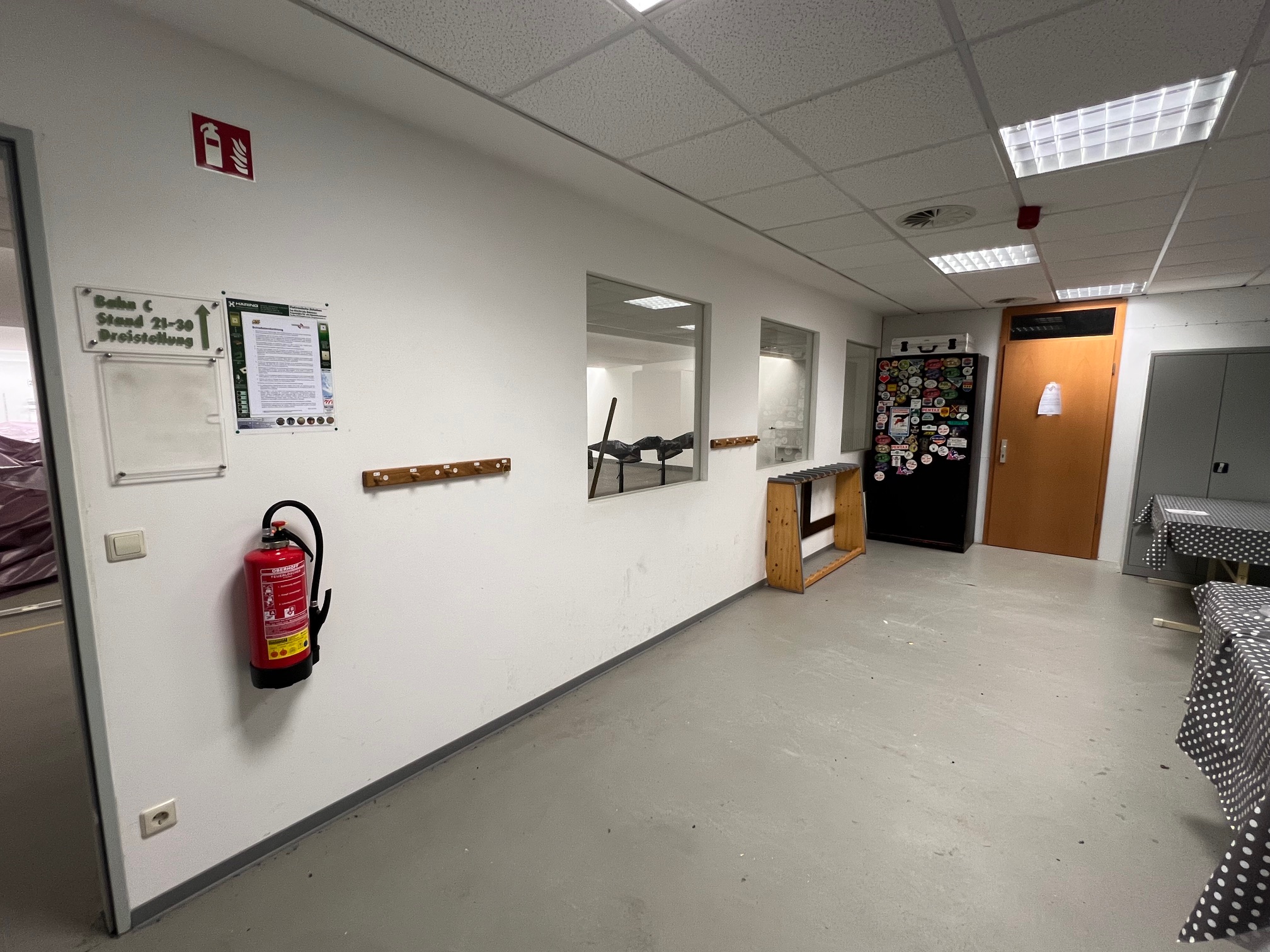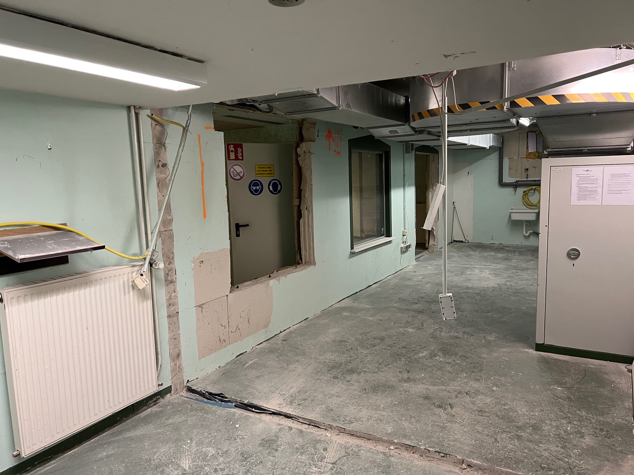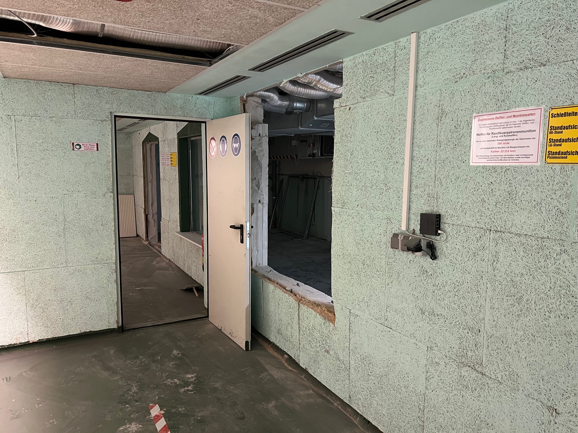 Mittlerweile kann man schon sehen, dass sich einiges verändert, auch an den Räumlichkeiten, z.B. der neue, separate Zugang zum GK-Stand oder das neue Fenster im Vorraum des KK/GK-Standes. Zukünftig können alle Stände vom Steuerungs-PC aus eingesehen werden. Oder auch im bisherigen Auswerteraum, der zum Teil als Behinderten-WC und Getränkeraum umgebaut wird, sind die Türausschnitte bereits freigelegt. Für die Auswertung bleibt aber noch genügend Platz. Auch wurden die alten Versorgungsleitungen freigelegt, damit dort die neuen Versorgungsleitungen für die Lüftungsanlage ebenfalls untergebracht werden können.